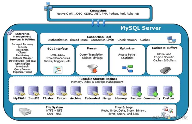 Enterprise Management Service & Utilities:管理服务和工具组件,功能如备份恢复、mysql复制等。