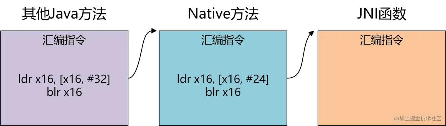 以下是其他Java方法调用native方法时实际发生的跳转过程。