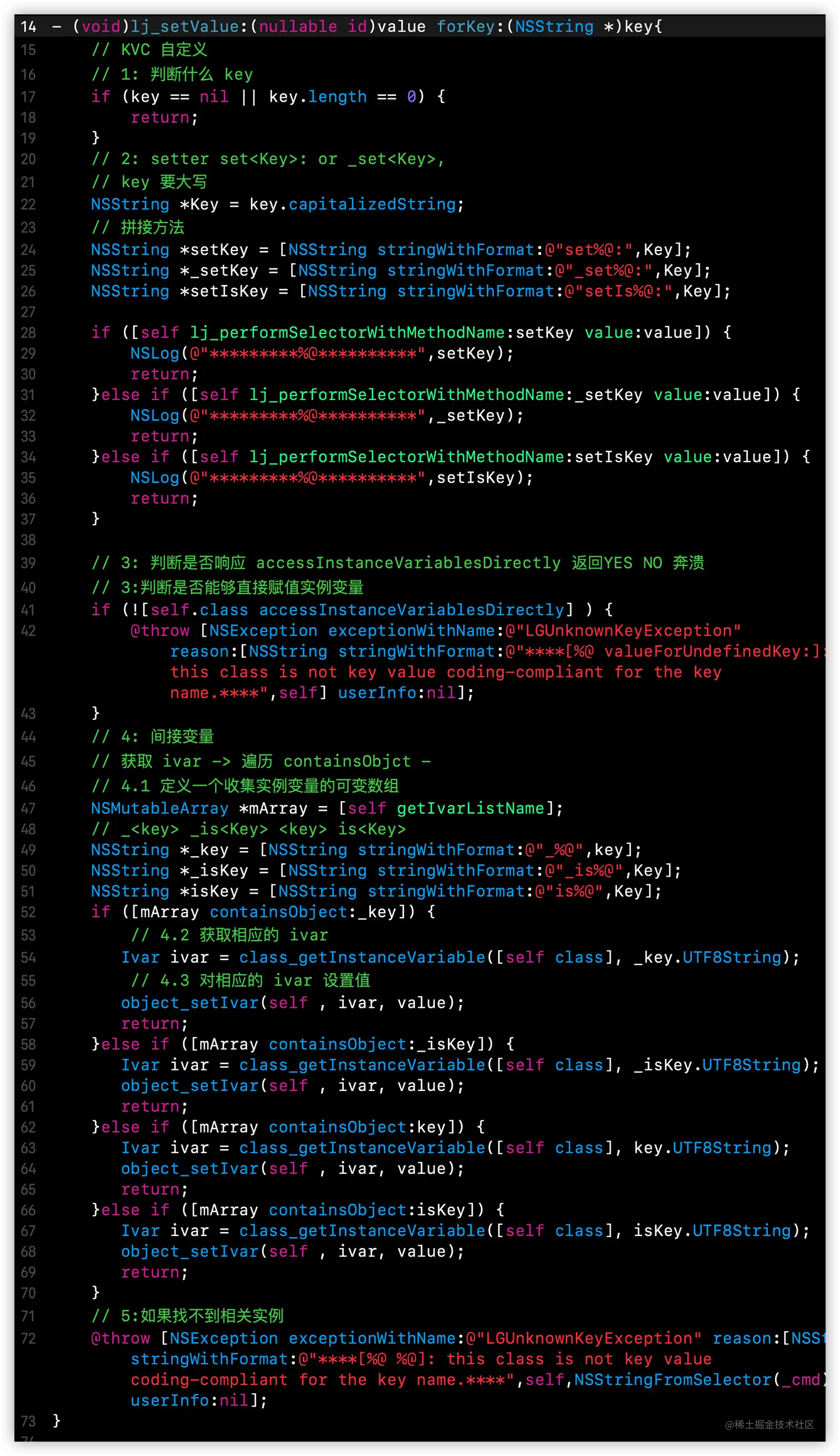 顺序:getKey、Key、countOfKey、objectInKeyAtIndex: (key都为传入的key值)。 - 3.判断accessInstanceVariablesDirectly是否为YES(是否能够直接赋值实例变量,YES是可以)。为NO则抛出异样。(抛出异常就为崩溃)。