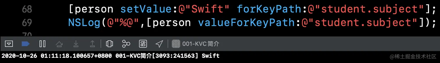 [person setValue:@"Swift" forKeyPath:@"student.subject"];
