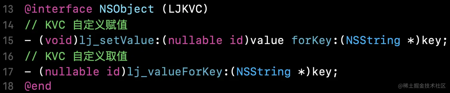 上面我们讲了KVC的set赋值以及取值过程,所以自定义KVC其实就是实现上面说的那些方法。下面我们创建一个NSObject分类LJKVC