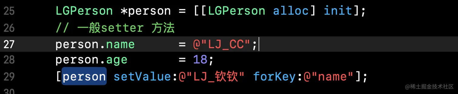 在日常开中,我们经常用的赋值就是setter方法或者用KVC进行赋值,如下图所示: