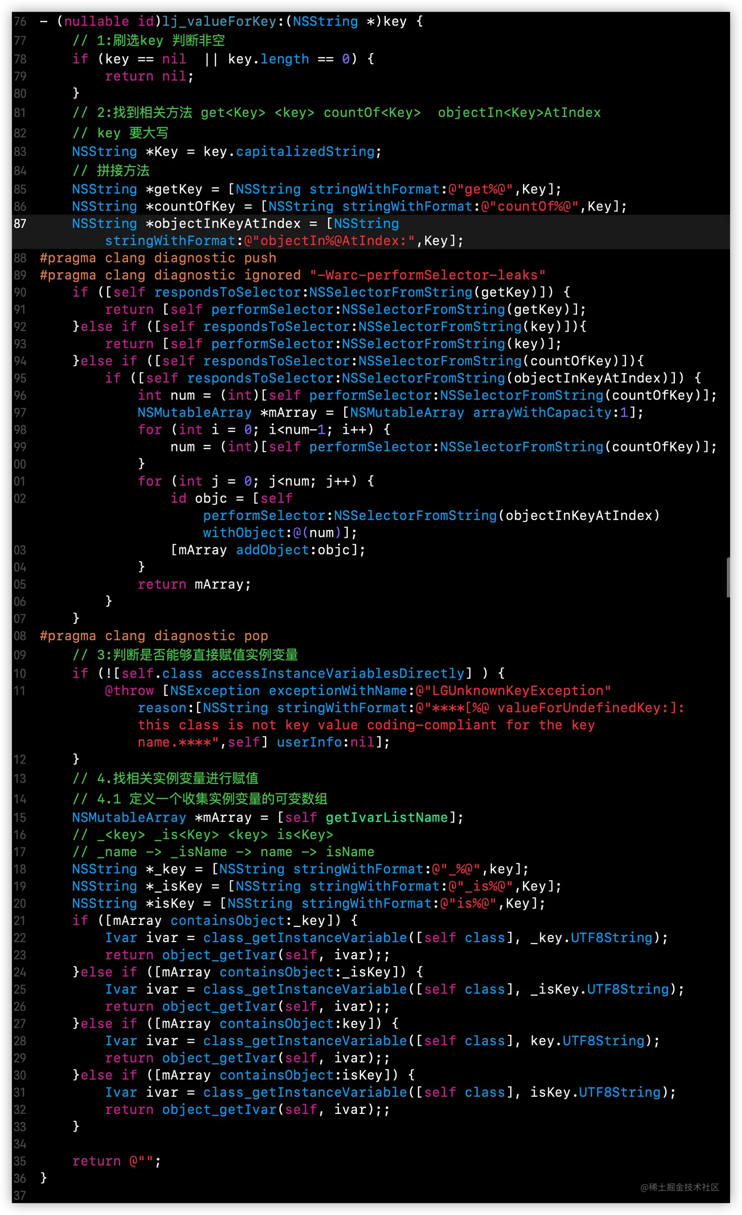 同样赋值原理的探索一样,我们同样可以通过官方文档和GNU代码去研究。 下面我们研究一下执行valueForKey:时的底层变化。