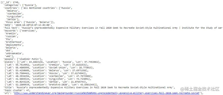 最后一步是将我们提取的所有数据集中起来。对于这些数据,我更喜欢JSON格式。这是因为我想以不同的方式组织某些类型的数据—例如,locations字段将包含地名、纬度和经度的字典列表。在我看来,JSON格式是将这种格式化的数据存储到本地磁盘的最有效的方法。我还在文档数据库MongoDB中备份了这个数据库的副本,但这不是本文的重点。