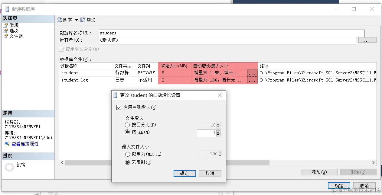 新建库的过程 ifubing 2020-10-30 152 阅读1分钟 数据库,右击,新建数据库 初始大小与增长策略 存储路径 建表成功 看不见库就刷新一下 关注两个文件 mdf,main data file ldf,log data file