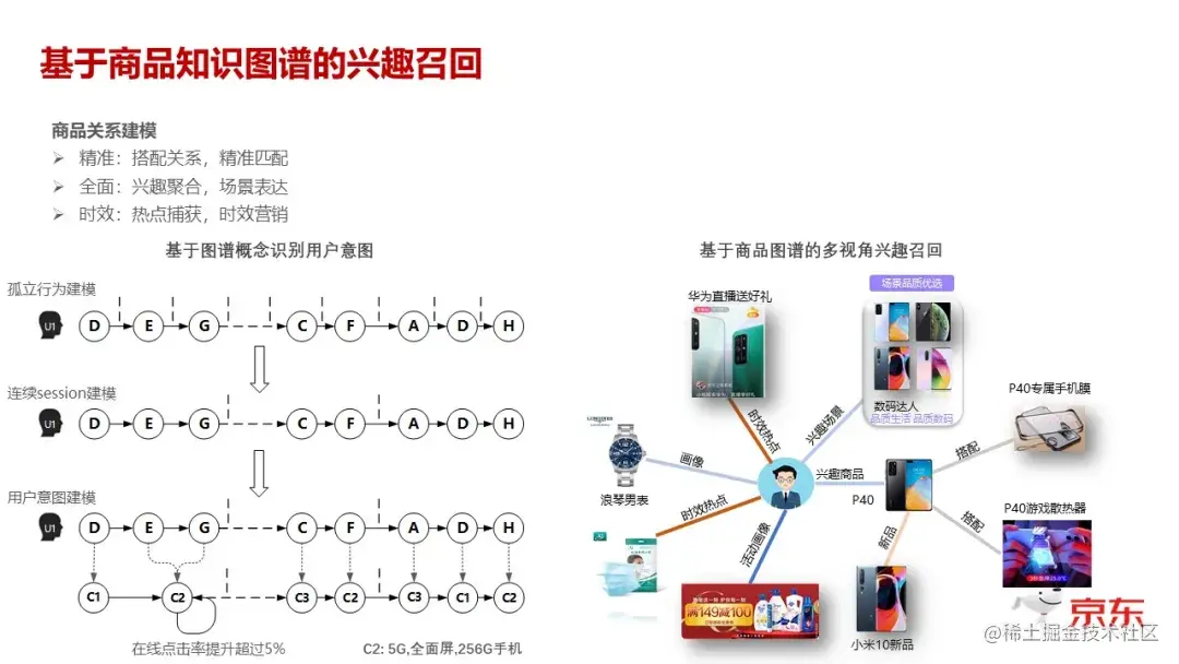 上图右侧的图,其实刚刚已经大概提了,在一个用户跟一个商品发生关联之后,那么基于商品的知识图谱,你就可以建立出来很多关联。这是在召回方面我们所做的一个创新,其实最主要的工作就是知识图谱的构建。