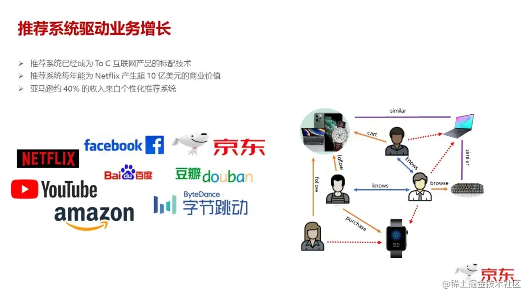 国内外大家能够看到的一些报道,像 Netflex、Amazon、Facebook、国内的 BAT,尤其是移动时代开始之后,手机屏幕这种手指和屏幕自然的交互方式,自然而然使得推荐系统几乎成为每一家移动互联网公司的标配。推荐系统是公司花费非常多的人力和财力去打造的一个系统,同时这个系统也为各个企业带来了非常大的商业价值。