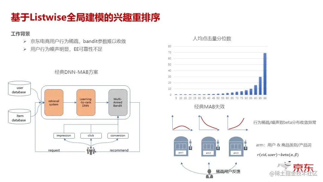 讲完 CTR,最后,我们再来看一下,当我们预估出来 CTR 值和 CVR 值以后,对每条预估出来的结果进行最终的排序。正常情况下,如果不考虑多样性,不考虑 Explore 这些特征,其实只要按 CTR 预估值从高到低排就行了。如果按照这种方式排序,那么你 Explore 出来的东西,大概率是出不来的。传统的方式是,我会在 CTR 预估后面再加一个 Explore 层。我这里画了一个用户人均点击的分类图,可以看到,绝大部分用户的点击都是处于长尾的,用户行为很少,如果画商品,分布趋势会更明显。因为我们数十亿的商品可能绝大部分都是有用户行为特别稀疏的。最早我们尝试这个事情的时候,用多臂老虎机,我们基于每个用户看过或者点击过的商品的品类和产品词来做 arm。那么在用户行为缺失的情况下出现的问题,要么就是多臂老虎机基于 Data 函数,学到的 Beta 分布,要么就是数据量太少,它是不收敛的,要么就是几个正例,或者几个负例,实际上是带着噪音性质的,所以它画出来 Beta 分布出的曲线,都是因为稀疏,或者是噪声导致整个 Beta 分布是没办法收敛的。