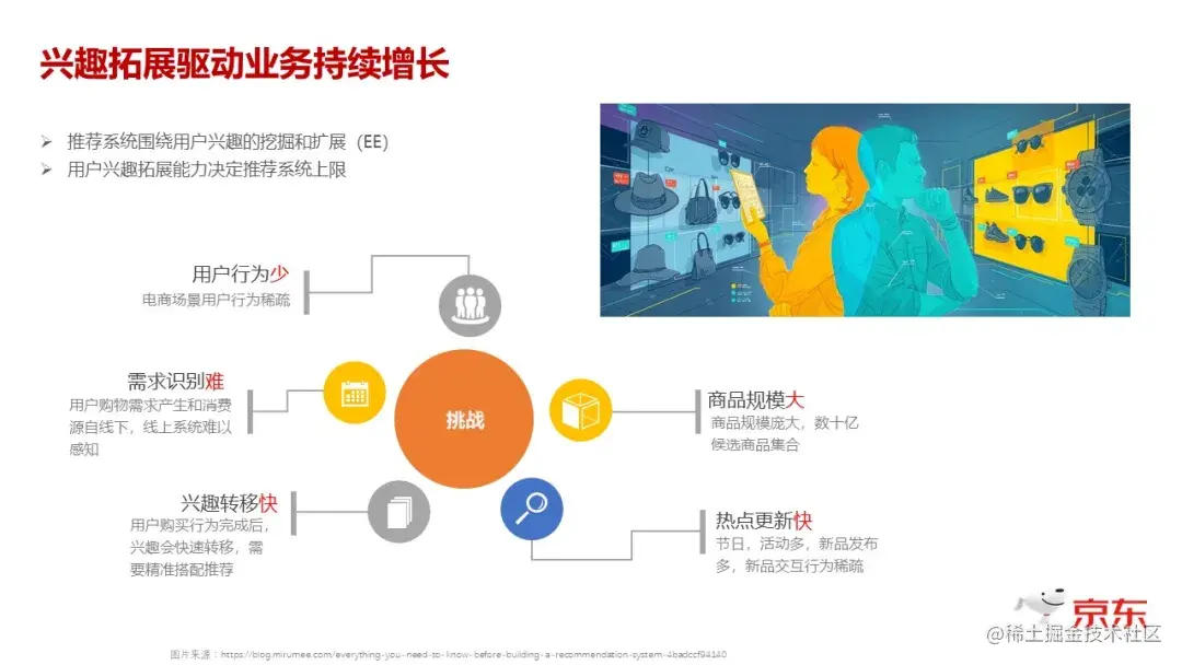 兴趣的拓展,其实对于各种推荐系统都很重要,但对于电商来说尤其重要。因为对于电商来说,你需要引导他去买,在你的平台上下单,如果你只是满足了他买的这个商品,其实也就意味着你的系统的上限是有限的,不管是对于用户也好,或者对于你平台上的商家也好,那么其成长空间是有限的。所以拓展用户兴趣以及基于拓展出来的兴趣帮他做推荐,对于电商系统来说尤其重要。但这个事情对于电商系统来说,又是个特别难的事情。我们从用户和商品两个纬度讲一下: