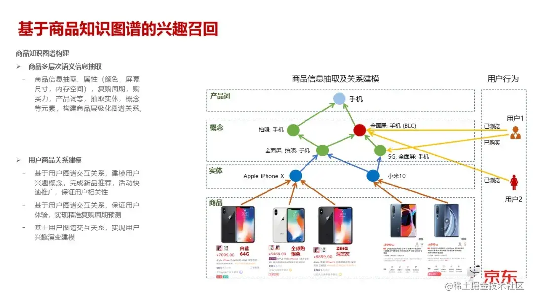 这个实体的概念其实主要是在用户感知的概念里头,它是唯一的一个商品的集合。所以它的基础过程,第一步是基于标题、上下文的文本描述抽取出的这个过程。第二步是基于一些用户行为所做的一些具促之类或者是说一些数据清洗之类的逻辑去做的一个实体。实体再上面一层,我们叫概念层,这个概念层体现出来的也是一些用户关注的商品的属性,比如说这里举个手机的例子来说,那可能它关注这个手机的主打的功能是不是拍照,是不是全面屏,是不是带 5G,也就是类似于这种用户特别关注的某一个属性,我们叫概念层。