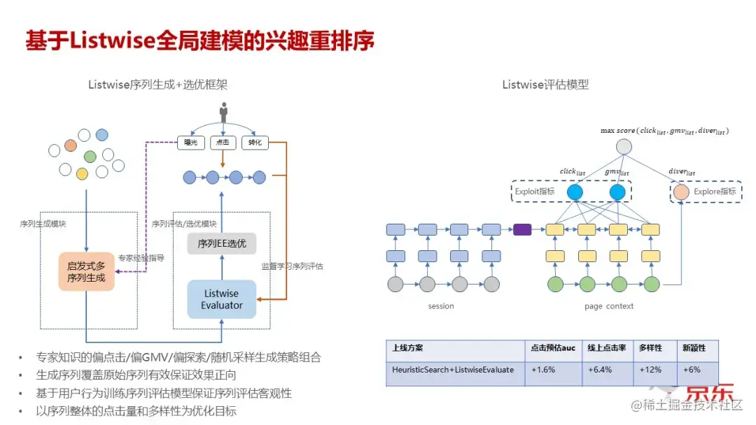 再上面那一层,可以看到,它优化的这个目标不再是单条的、单个侯选集的结果,而是整个队列的点击,整个队列的 GMV,还有整个队列的多样性,以这几个指标融合在一起才是整个 Listwise 打分模型的优化的指标。因为整个这个优化目标它也是有监督的,因为它优化的都是点击 GMV 和多样性,这个方式相对于我们原来的排序方式,首先我们性能上上线的时候,经过这种设计之后并没有受到特别大的挑战,整个上线之后,也是同样的,我们做到了点击和多样性,以及用户探索出来的这个商品的这个占比都有显著的提升,并且提升的幅度其实在我们历史的上限里相对来说特别显著的。