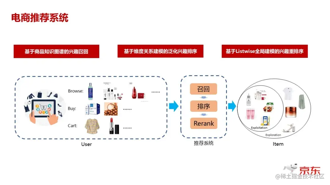大家能看到下图中的三个环节,左边是描述传统的、我们记录下来的用户的行为,包括他的浏览、购买、加购等所有电商平台能够在线记录下来的行为,正常的推荐系统都是分为几个环节: