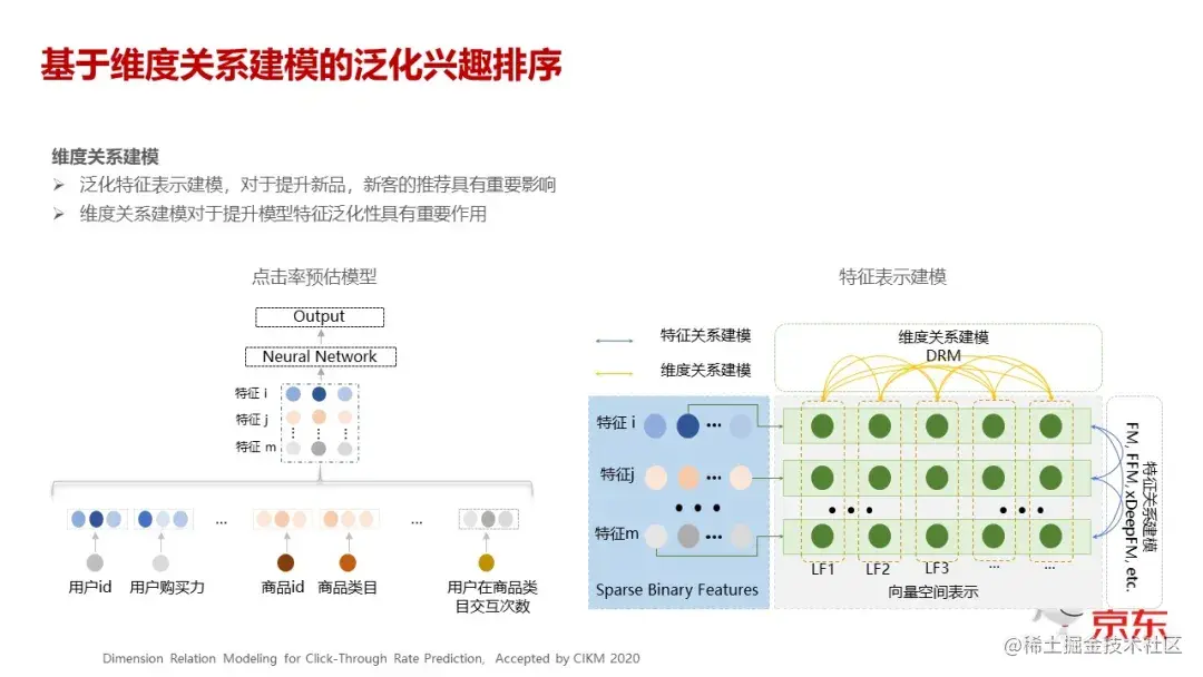 最近,大家觉得这个 Concat 做得比较糙,通常的做法不再是横着 Concat,而是把它组成一个矩阵。这个矩阵进去之后,在特征的纬度之间,大家可以看到右边这个图,就是通常的 FM,或者 FMM,或者一些常用的方法,这些都是我们在不同的特征之间去建立关联。我们的创新是在不同的纬度之间也建立同样的关联,去构建纬度之间的关系,就是想把这个 embedding 的特征刻划得更精细一些,以提升整个模型的表达和泛化能力。