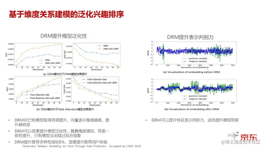 所以我们可以看到,DRM 层引进之后,明显的改变就是对你输入的语言 sparse 特征转换过 embedding 刻画得更精细了,模型的泛化能力有了明显的提升,尤其是在 embedding 纬度高的时候,它能够明显地解决原有模型的过拟合的现象。