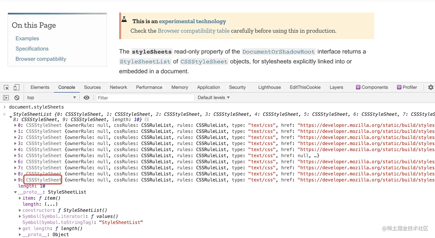 可以看到document.styleSheets打印出一个由 CSSStyleSheet 组成的数组