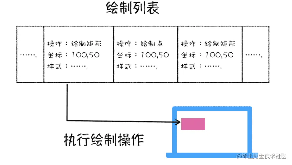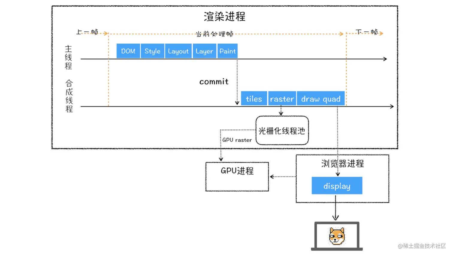 绘制阶段其实并没有执行真正的绘图操作,而是 对每一个图层生成由一个个绘制指令组成的绘制操作列表,当图层的绘制列表准备好之后,主线程会把该绘制列表提交(commit)给合成线程去执行真正的绘图操作(这也是为什么经常主线程卡住了,但是 CSS 动画依然能执行的原因)。