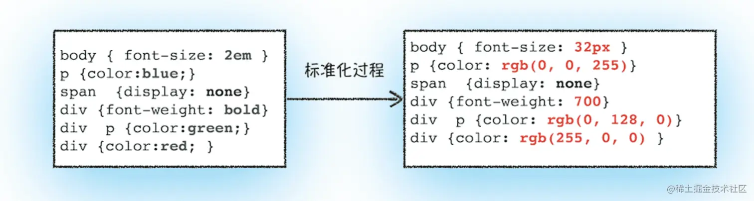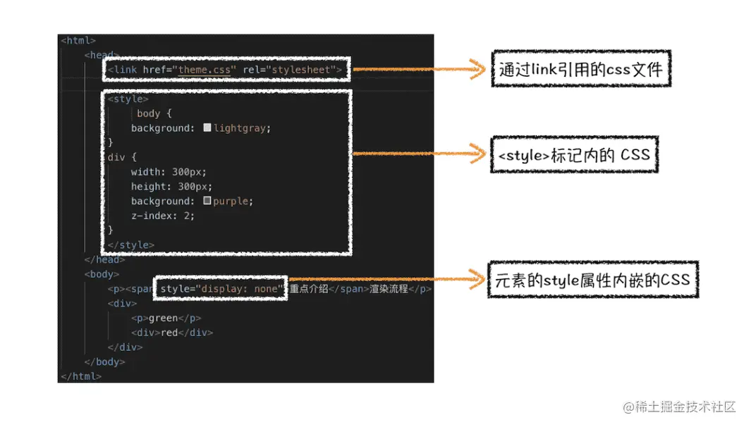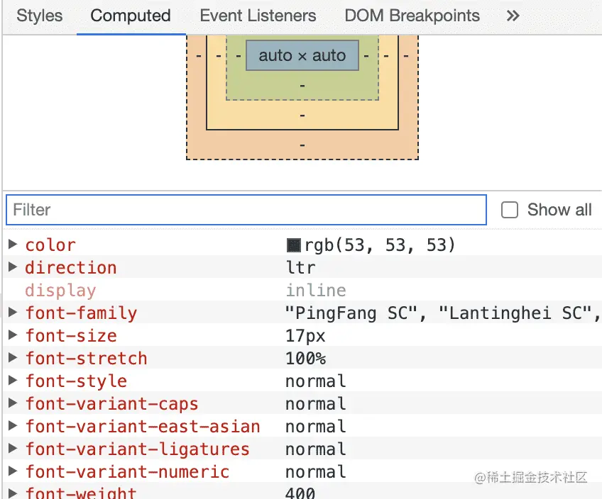 一个节点的样式可能来自于任一个css来源,并且存在 CSS 的继承、层叠、优先级计算等规则,浏览器最终会计算出每个节点的最终样式,可以通过chrome dev tool的 Computed 标签查看最终应用到具体DOM节点的样式。