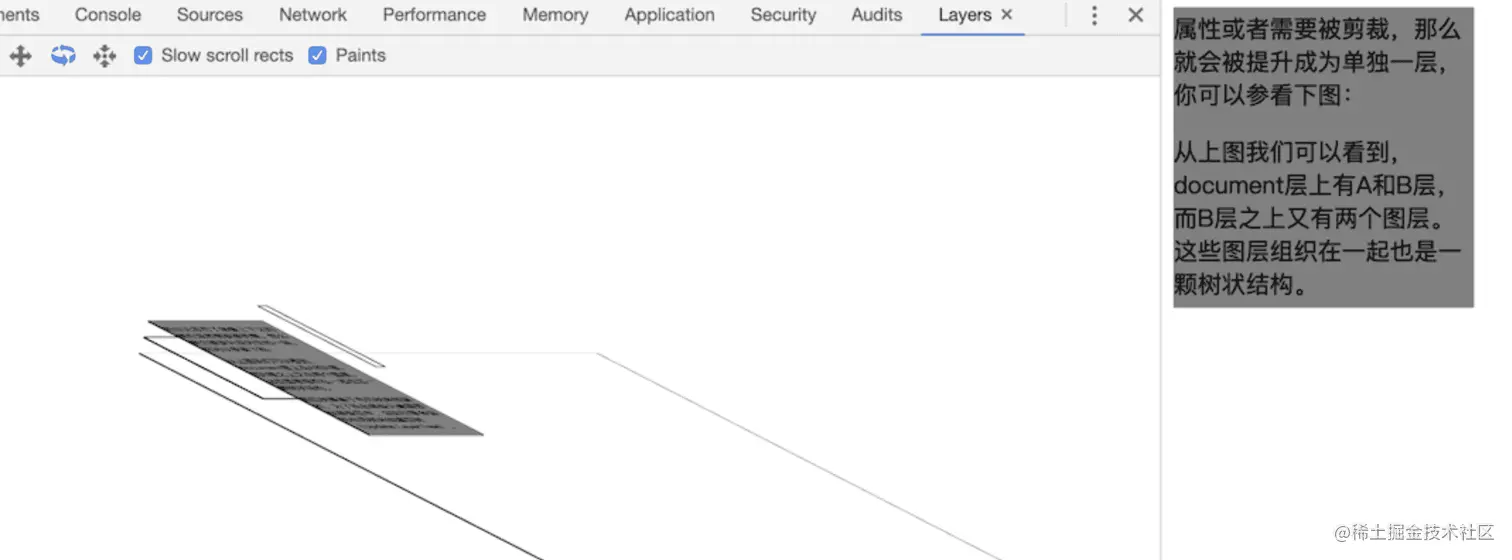 我们都知道 css 其实可以描述很多复杂效果,包括各种3D变幻、页面滚动、悬浮等,所有其实页面在底层并不是一个二维空间,而是一个有 z 轴的三维空间,我们作为观察者看到的是所有可见图层的叠加效果。一些满足了特定条件的元素会被绘制在单独的一层,具体的可视化效果我们使用 chrome dev tool 的 Layers 工具去查看当前页面的图层关系。