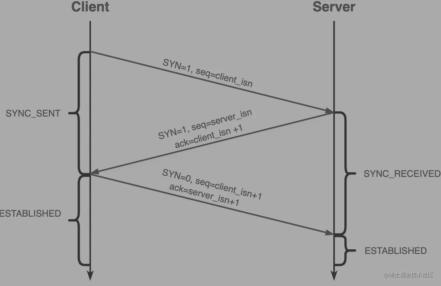 - 客户端发送 ACK = server_isn + 1(客户端发送后进入ESTABLISHED,服务端收到后也进入ESTABLISHED)