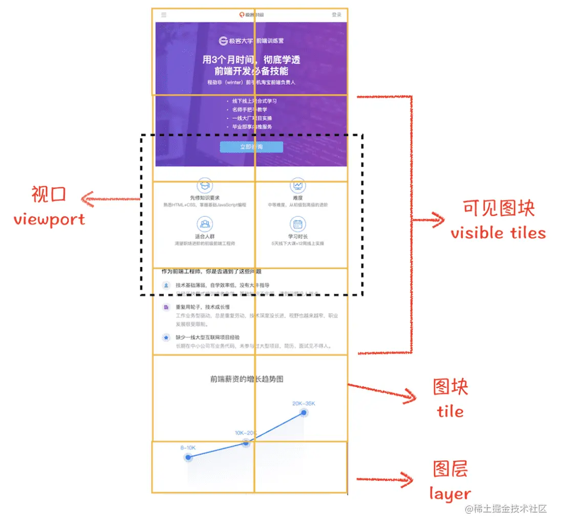 一个页面可能比浏览器视口要大得多,从效率的角度来说浏览器没有必要提前绘制那些我们看不到的区域,事实也是如此,合成线程会将页面划分为多个图块,并且优先将视口附近的图块生成位图。
