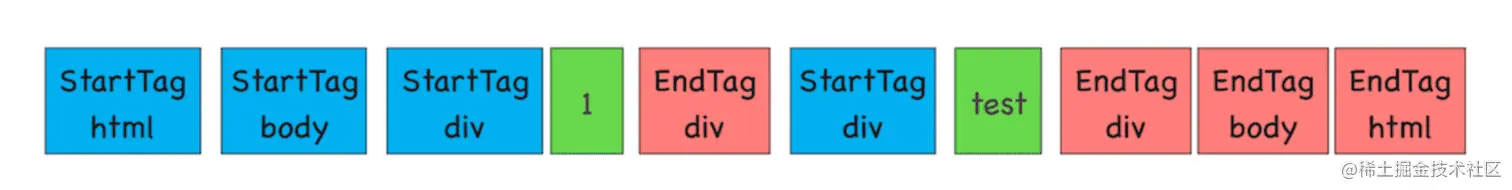 - 如果分词器解析出来的是 EndTag 标签,比如是 EndTag div,HTML 解析器会查看 Token 栈顶的元素是否是 StarTag div,如果是,就将 StartTag div 从栈中弹出,表示该 div 元素解析完成。