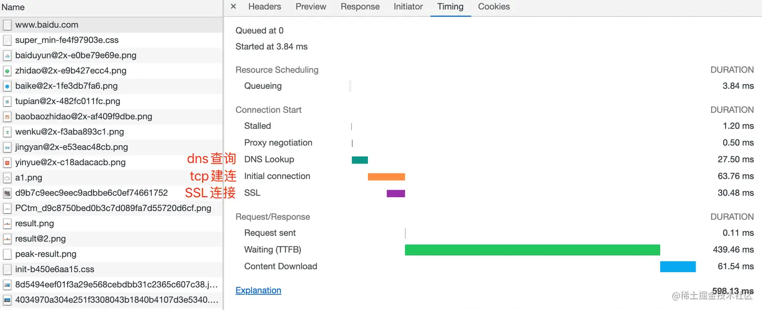 最后我们来看一个真实案例,浏览器输入baidu.com,html请求依次包含了以上所说的步骤,关于Queueing、Stalled、Proxy negotiation等其他几个时间指标的官方解释在这里。