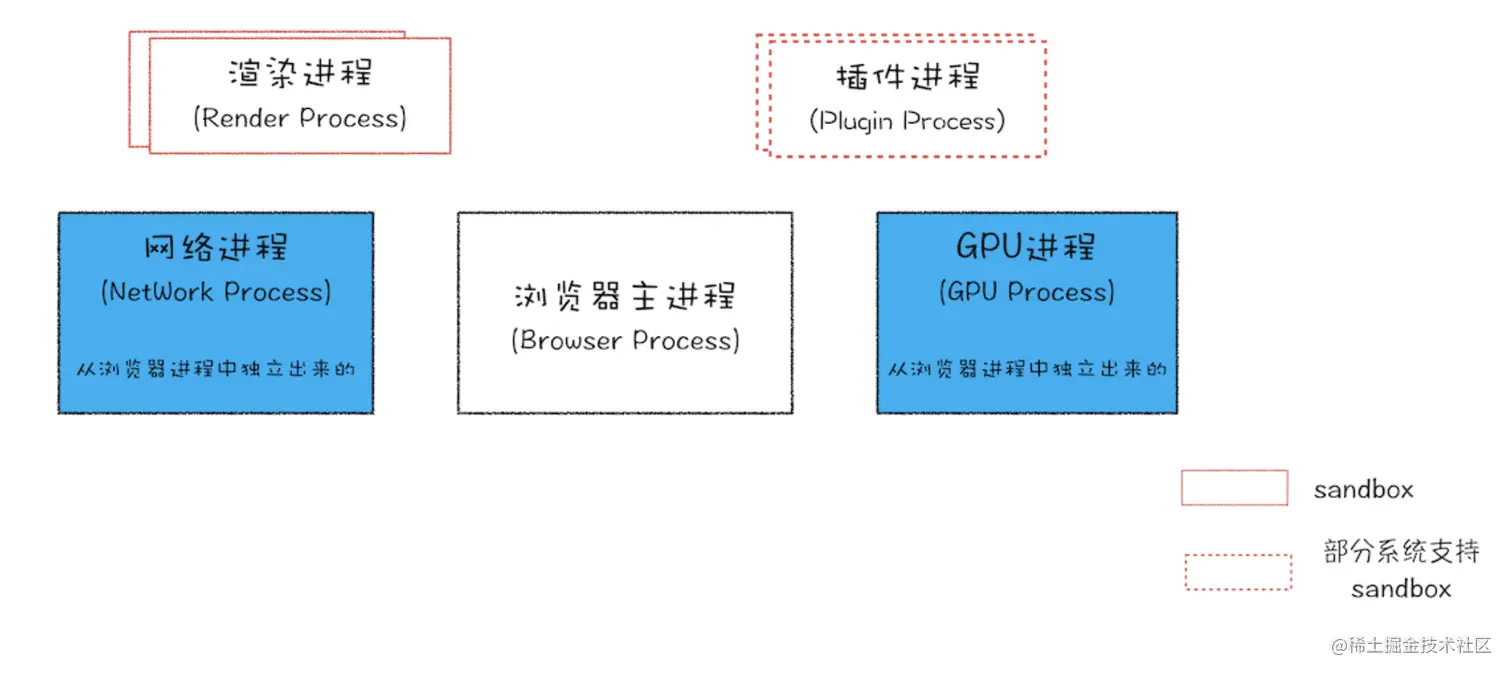 - 渲染进程。核心任务是将 HTML、CSS 和 JavaScript 转换为用户可以与之交互的网页,排版引擎 Blink 和 JavaScript 引擎 V8 都是运行在该进程中,默认情况下,Chrome 会为每个 Tab 标签创建一个渲染进程。出于安全考虑,渲染进程都是运行在沙箱模式下。