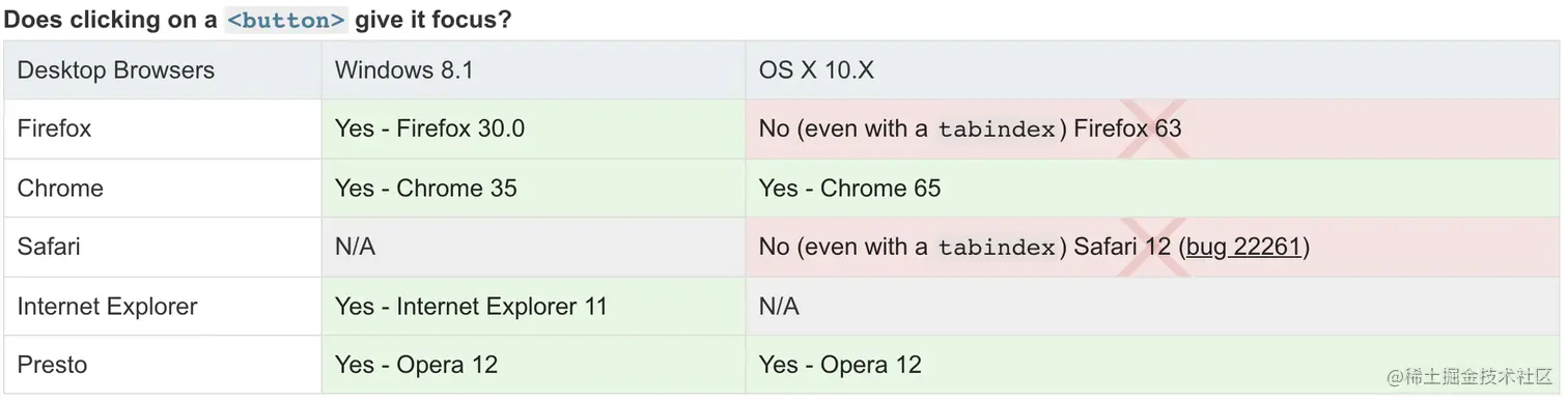<button>元素,不会触发<button>的 focus 事件,也没有 focus 事件冒泡。 - 在 Windows 的 Safari 和 Firefox 中, 点击