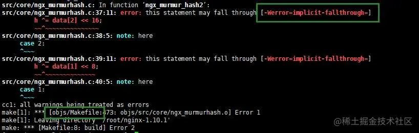 原因是是将警告当成了错误处理,打开 nginx的安装目录/objs/Makefile,去掉CFLAGS中的-Werror,再重新make