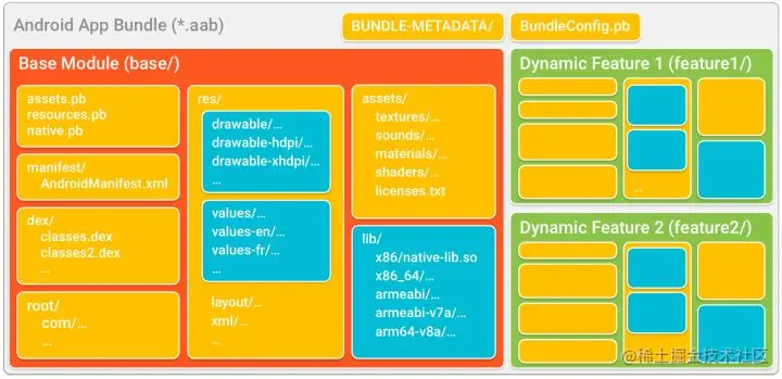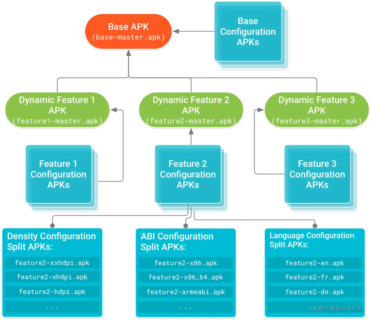下图是一个使用BundleTool将aab拆分为多个apk文件的结构示意图。