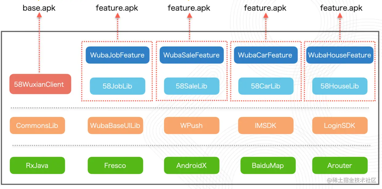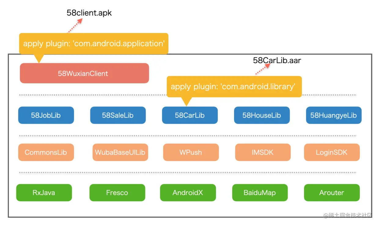 下图是58app工程结构图,上层依赖于下层,最上层是应用壳工程产物是58app的apk,下层是所有业务库和基础库应用的插件是Library产物是aar,各业务库之间代码不可见。