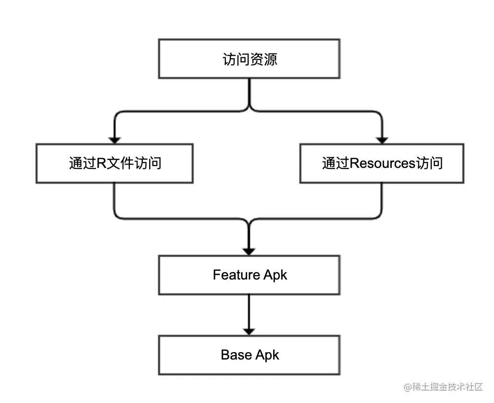 对于资源访问问题,解决思路如下,feature中的资源访问分两种情况:一是访问的资源本身不在feature apk中,可以通过feature的R资源文件查询,这时我们直接将访问资源的包名修改为base的包名;另一种情况是访问的资源可能在base apk中,也可能在feature apk中,这时我们需要从feature和base中遍历查找到真正的资源。