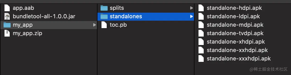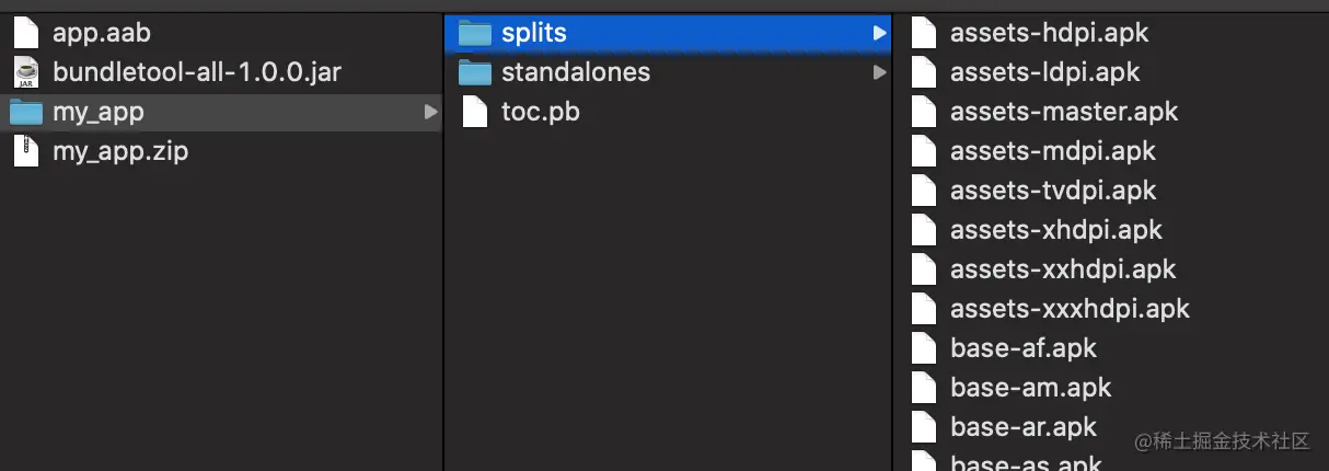 使用BundleTool可以将aab文件拆分为多个apk,BundleTool的产物其实是一个压缩包,解压后可以看到不同设备密度、CPU架构、语言配置的多个apk。