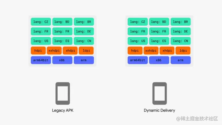 在Google Play应用市场上传aab可以很好地解决前面提到的问题,唯一一点让开发者顾虑的是需要将签名文件上传到应用市场。下图是传统apk和aab动态分发的一个效果图: