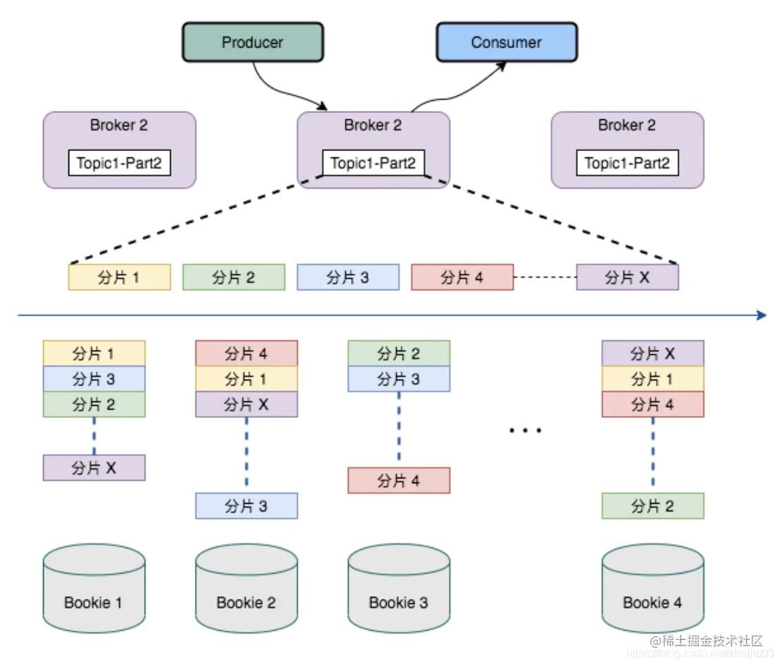 Pulsar 的多层架构影响了存储数据的方式。Pulsar 将 topic 分区划分为分片(segment),然后将这些分片存储在 Apache BookKeeper 的存储节点上,以提高性能、可伸缩性和可用性。