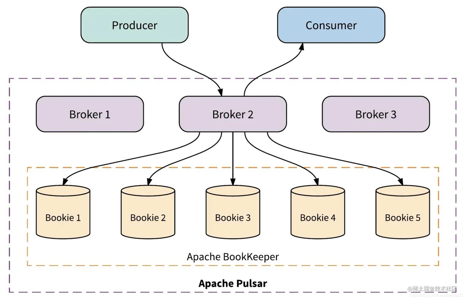 Kafka 采用单片架构模型,将服务与存储紧密结合,而 Pulsar 采用了多层架构,各层可以单独管理。Pulsar 在 broker 计算层进行计算,在 bookie 存储层管理有状态存储。