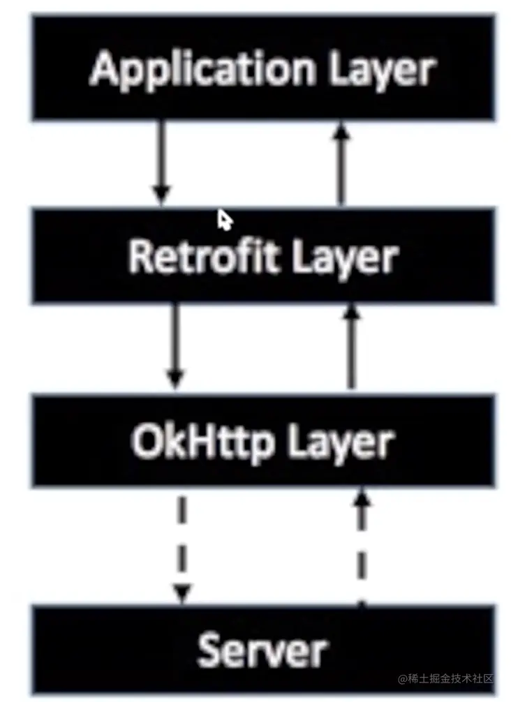 - 在服务端返回数据之后,OkHttp 将原始的结果交给Retrofit, Retrofit根据用户的需求对结果进行解析