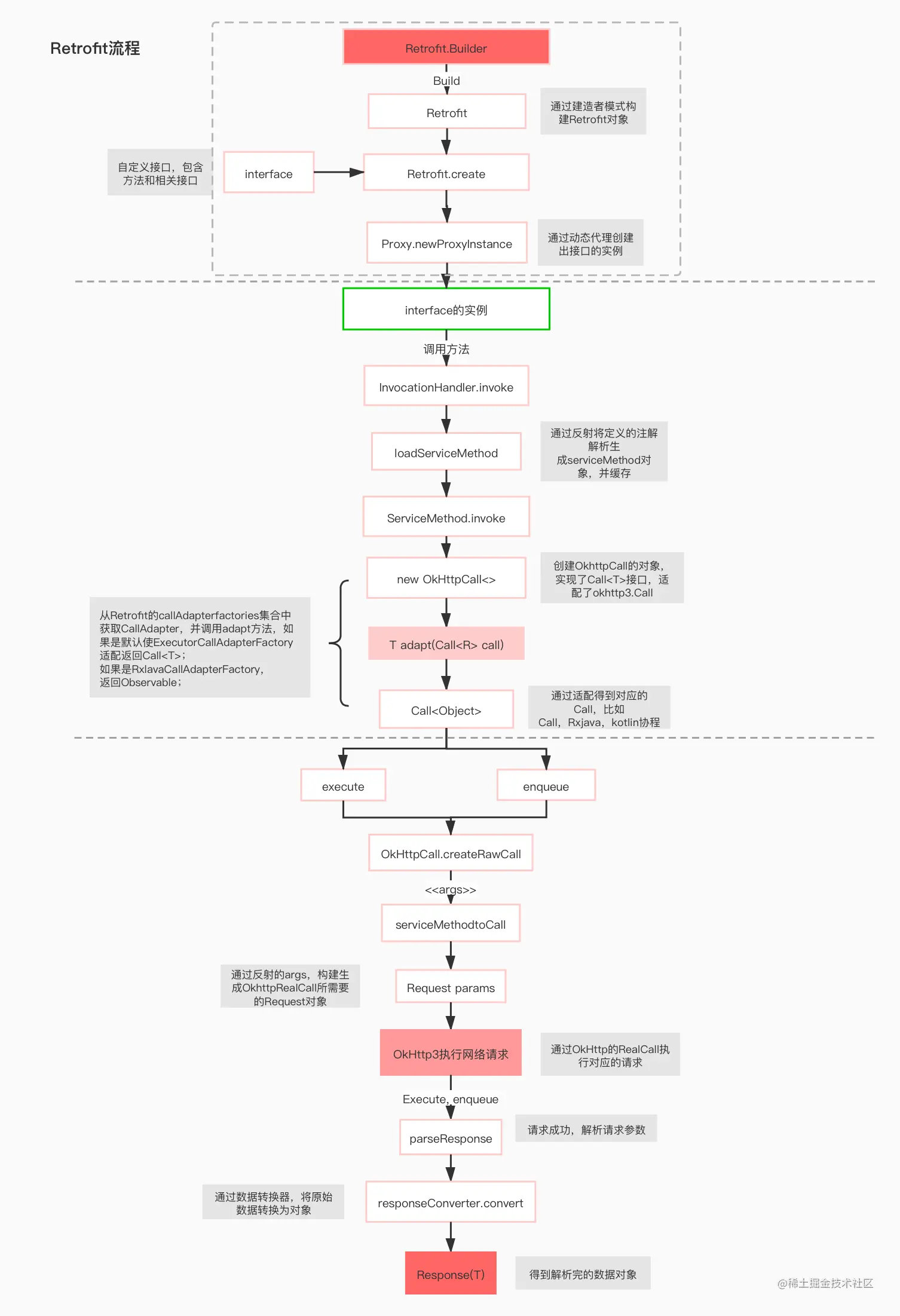 - 而这个对象可以在需要的时候(例如它的 enqueue() 方法被调用的时候), 利用 RequestFactory 和 OkHttpClient 来创建一个 okhttp3.Call 对象,并调用这个 okhttp3.Call 对象来进行网络请求的发起,比如异步的enquue。