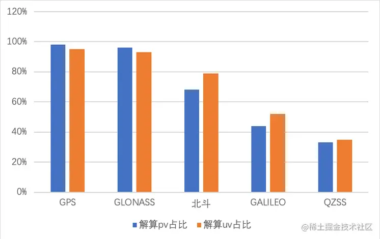 我们对比了手机端GNSS定位时,使用不同系统的占比,可以看出GPS和格洛纳兹由于发展的比较早,在手机芯片侧的渗透率比较高,因此被使用的比例也最高,其次就是北斗。