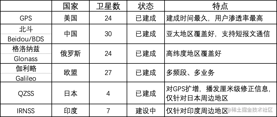各种卫星定位系统使用的技术类似,大多采用中轨道卫星(MEO,卫星高度2万公里),少数采用了地球同步轨道(GEO,卫星高度4万公里)和地球倾斜同步轨道(IGSO)。同时,信号播发大多采用CDMA技术,实现在同一个频率上传输多颗卫星的信号。为了让地面设备能够较好的接收来自几万公里外的信号,信号的数据速率都比较低,比如GPS L1频段的数据传输速率只有50字节/s,根据香农定理,C=B*log2(1+S/N), 在频率带宽B固定的情况下,随着传输速率C的降低,接收端在信噪比(S/N)比较低的时候也可以解出正确的信号,有利于持续的锁定、跟踪卫星信号。