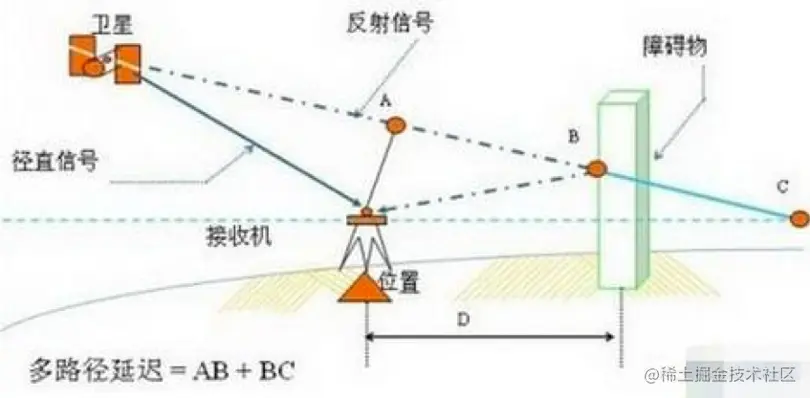 卫星信号从发射到被设备接收,需要经过大气层,其中,大气电离层有数千公里厚,这部分大气非常稀薄,但是存在大量被电离的电子,这部分电子会让电磁波变慢一点,从而产生延迟。在对流层,也会产生一定的延迟。在地表附近,由于各种建筑、山体、水面的影响,卫星信号可能被反射或折射(多径效应),产生延迟。