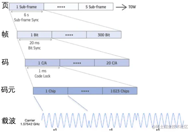像其他所有的通信技术一样,这些信息也是以报文的形式发送的,以GPS为例,卫星会每隔6秒发出一个包,而这个包会分解为数据位-CA码序列-载波波形,通过天线发射到地面。地面设备持续锁定卫星,在解算时,计算每颗卫星当前时刻的时间戳(用最近一次收到的时间戳加上报文偏移量),然后进行位置解算。