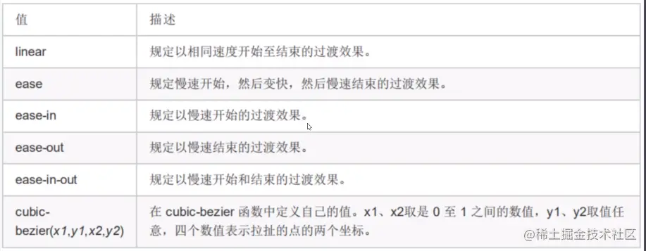 transition-timing-function 规定过渡效果的时间曲线。默认值是"ease"