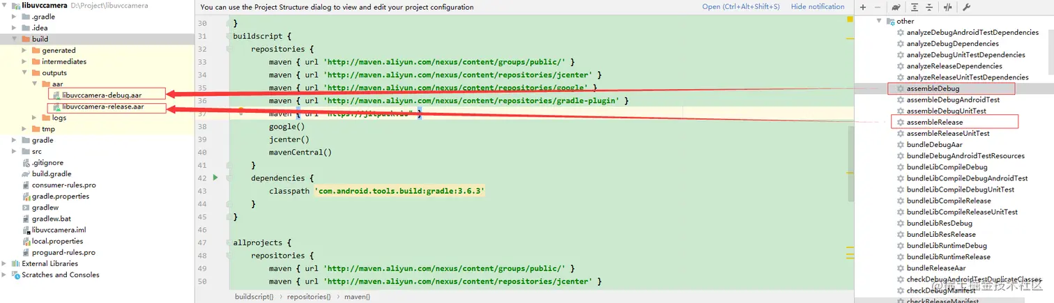 点击右侧的assembleRelease,执行完毕后,可以看到outputs文件夹下生成了.aar文件,不同的task生成不同的aar文件。
