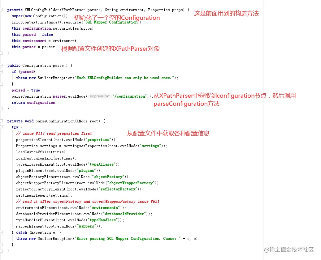 Configuration是通过XMLConfigBuilder的parse方法来的,而parse方法是通过XPathParser读取mybatis配置文件中的配置进行填充Configuration类。