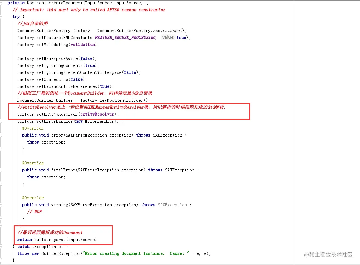 第二步createDocument方法是重点,作用是把最开始传进来的mybatis配置文件生成Document类给document属性,总览图中只有关键代码。方法详细源码如下图: