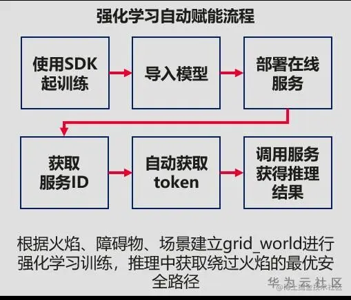 首先,机器狗将感知火焰位置,建立强化学习训练环境,自动上传至obs中。利用ModelArts SDK启动云端强化学习训练,训练机器狗如何找到最优路径灭火。训练结束后将在ModelArts平台导入模型、部署在线推理服务。此时只需要自动获取服务token和API就可以调用在线服务进行推理,获取安全路径,最终控制机器狗绕开火焰灭火。