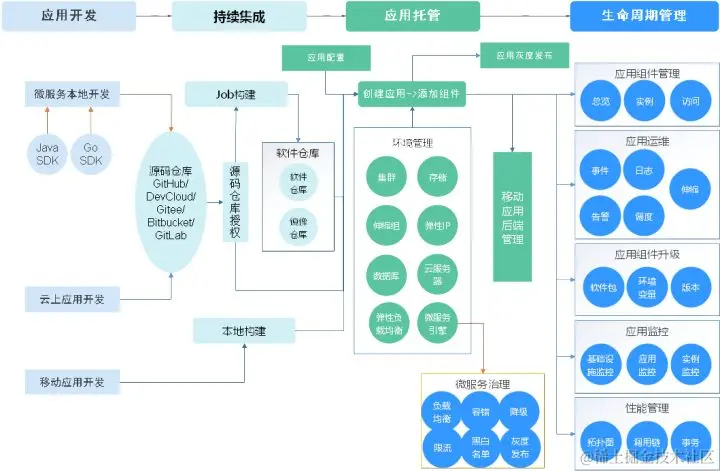 那有没有什么办法从项目开始就解决这个问题呢? 会后,我跟研发老大研究了一个新的方案:使用华为云应用管理与运维平台(ServiceStage)来做新项目的开发和管理。