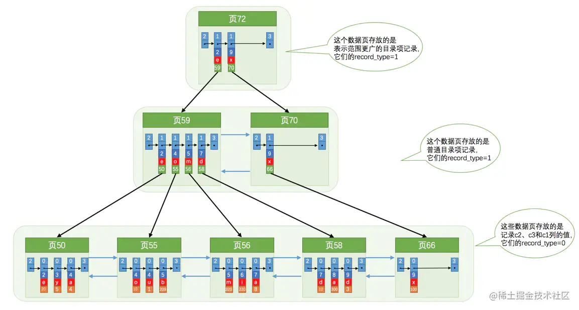 以主键索引为例,一开始会为索引生成一个根节点页面,后面插入数据时,都存储在此页,当数据不断增加,跟节点空间用完时,会将根节点数据复制到一个新分配页面a,然后对新页进行页分裂操作,得到页b,新插入的记录根据键值大小分配到页a或者叶b,根节点页面升级为存储目录项记录的页。