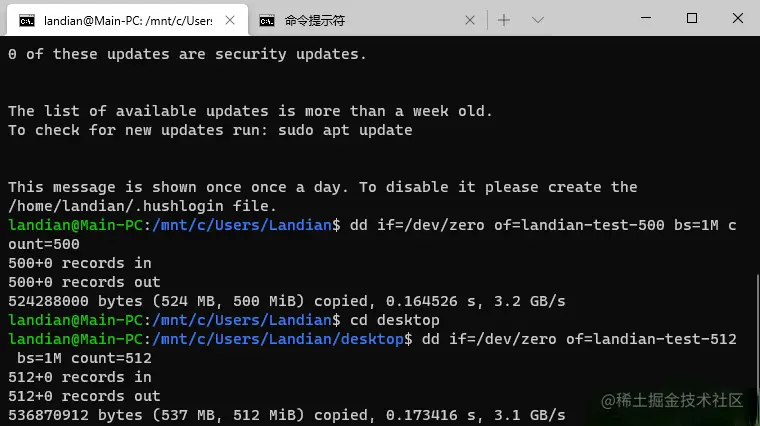 其中 landian-test-512 是文件名称、1M是文件大小、count=512是计数、即1M计数512次